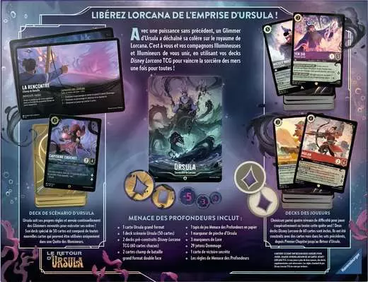 Menace des profondeurs contient deux decks préconstruits pour les joueurs*, mettant en vedette le sorcier Yen Sid de Fantasia de Disney et la courageuse Mulan. Les tours des joueurs sont simultanés, donc coordonnez-vous avec votre équipe, en utilisant des capacités et des effets sur les Glimmers les uns les autres pour ruiner les plans d’Ursula.